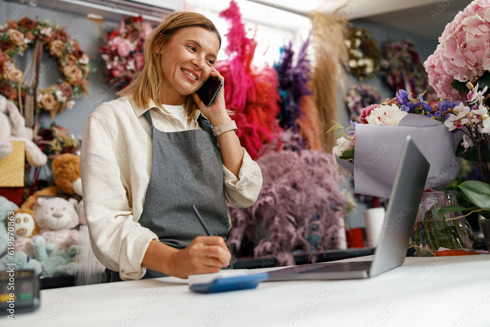 Smiling flower shop owner working on laptop computer. Occupation working concept