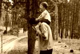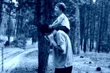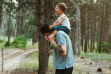 father's day. Happy European-looking father walks with his young cute two-year-old son on his shoulders in the woods