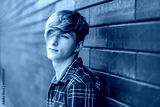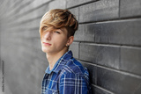 Portrait of caucasian young man teenager looking at the camera. Gray wall. Urban people style. Gen Z