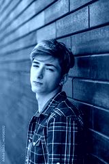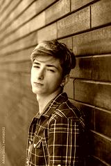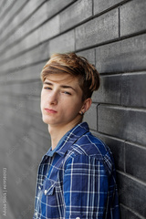Portrait of caucasian young man teenager looking at the camera. Gray wall. Urban people style. Gen Z