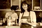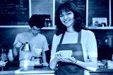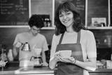 Portrait of young female waitress in front of counter in coffee shop