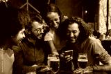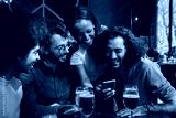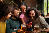 Young multiethnic group of people watching a mobile and smiling in a bar. Girl showing her phone to her friends. The gathering enjoys social media together. Millennials connected to smartphone