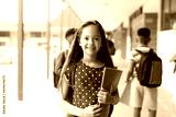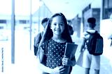Portrait of smiling cacuasian schoolgirl in elementary school corridor, with copy space
