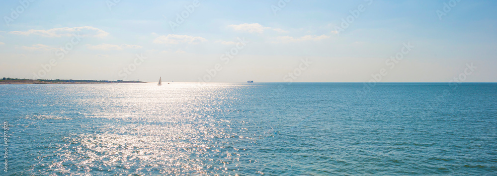 Sand beach along a sea under a dark blue cloudy sky in bright sunlight in summer, Zeeland, the Netherlands, June, 2023