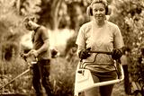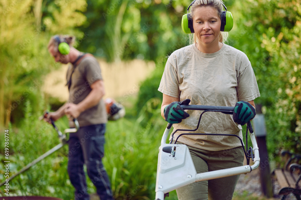 Young Female gardener using a lawn mower while her colleague or bosses is trimming the garden in the background