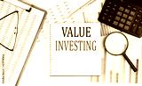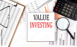 VALUE INVESTING text on notebook with clipboard and calculator on a chart background