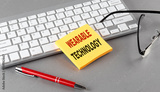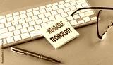 WEARABLE TECHNOLOGY text on a sticky with keyboard, pen glasses on grey background