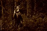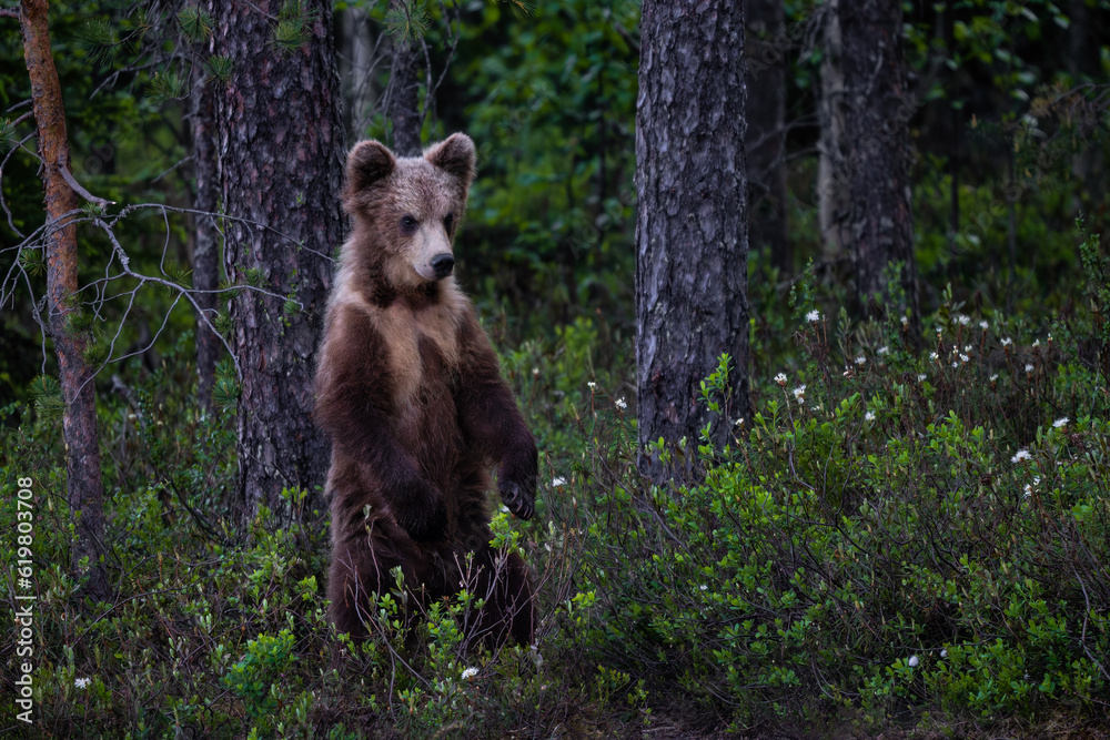 Brown Bear - Ursus arctos large popular mammal in iconic nordic European forest, Finland, Europe.