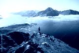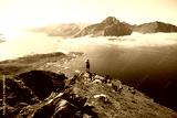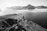 Silhouette of a hiker woman stand on top of mountain hike summit overlooking epic Lofoten Archipelago landscape. Inspiring and amazing idea of adventure. Roadtrip in Norway