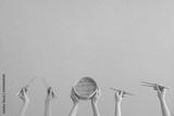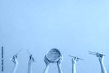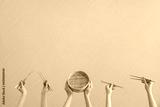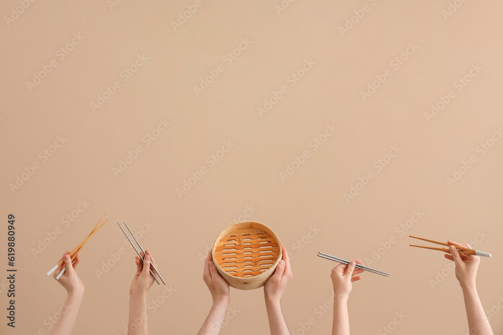 Hands holding different sets of chopsticks and bamboo steamer on brown background