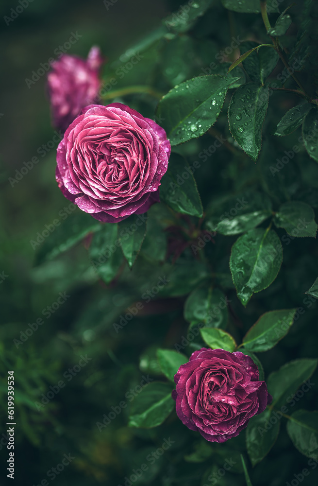 Garden pink roses grow on a green bush.Vertical photo with rose flowers. Sale of flowers from the nursery.