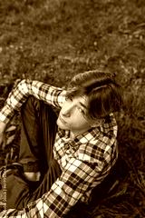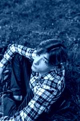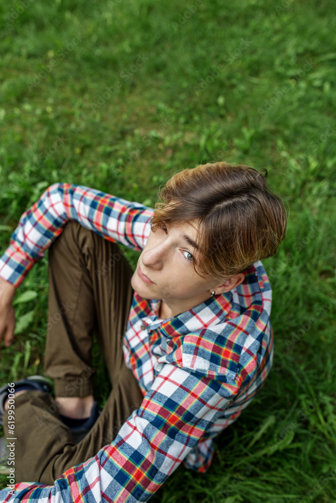 Portrait of serious teenager sitting on grass in park. Gen Z. Top view. Identity development.