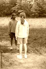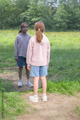 New generation and nature - concept. A teenage girl on a green meadow looks at herself in the mirror.