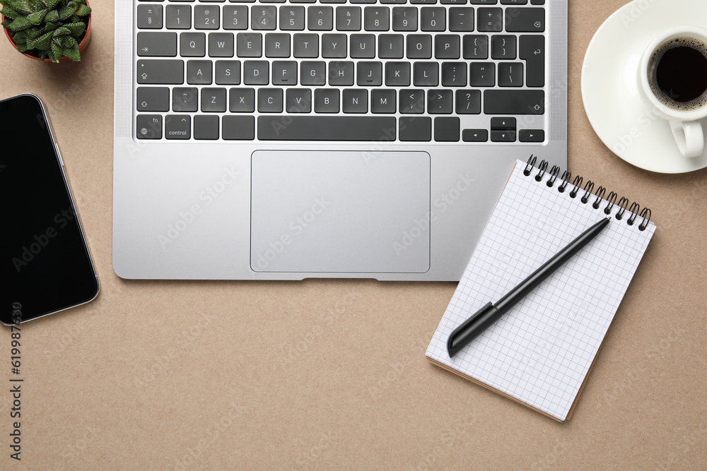 Modern laptop, notebook and cup of coffee on beige table, flat lay. Space for text