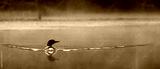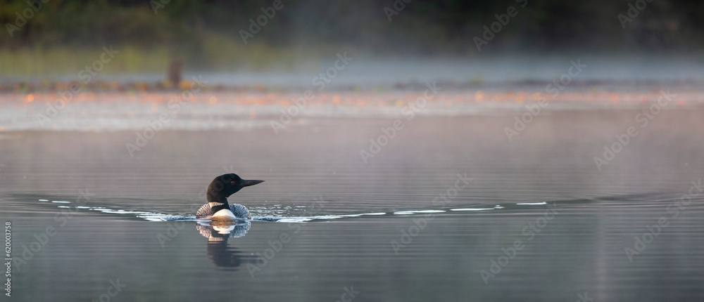 A loon swimming in early morning toward camera, looking to the side on a calm lake with a defined wake