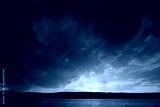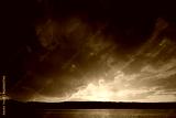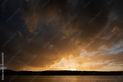 sunset over a lake with a silhouetted forest and large dark clouds taking over the frame with a center orange glow from the setting sun