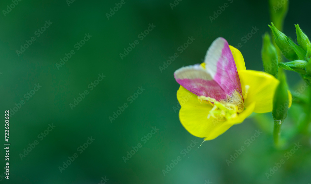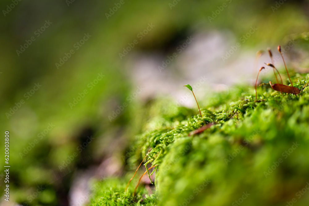 Macro close up of a leaf growing out of moss with shallow depth of field