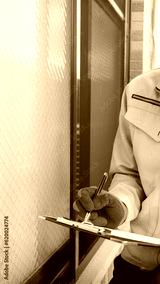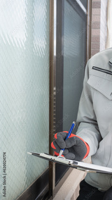 マンションの外壁、窓、網戸を点検する作業員|調査・見積りイメージ