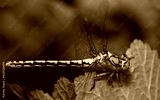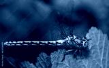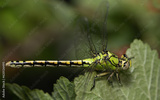 A green dragonfly, (Ophiogomphus cecilia), perches on the leaf of a currant bush. The body is striped with dark and green. The compound eyes are clearly visible.