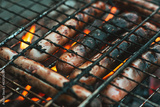 Milk sausages on a barbecue grill are roasted over a fire. Sausages in the flames of the fire outdoors. Yummy sausages