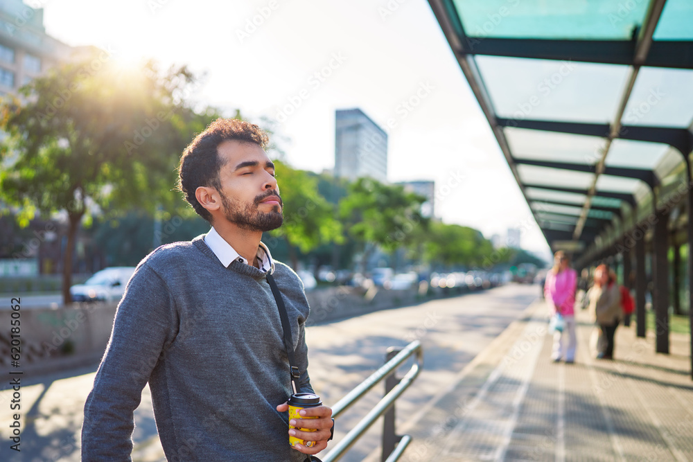 portrait young latin american white-collar worker at the bus stop with closed eyes pausing