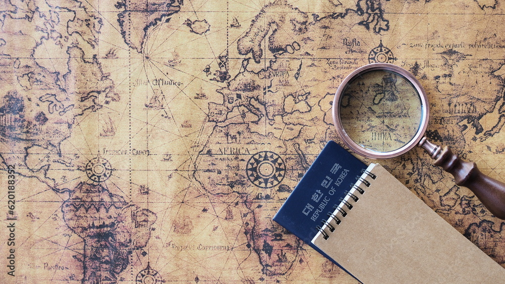 Top view of passport There is a magnifying glass, notebook and world map. travel concept
