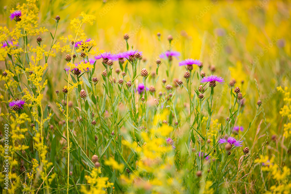 Brownray knapweed (Centaurea jacea) a herbaceous perennial plant native to dry meadows and open woodland. Purple violet flowers and yellow lady's bedstraw (Galium verum) on wild field in summertime.