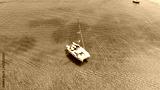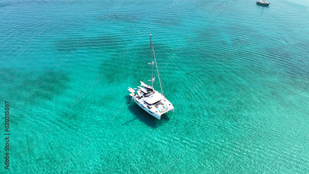 Aerial drone top down photo of luxury catamaran sail boat anchored in paradise exotic turquoise island bay