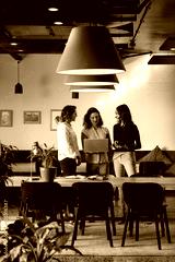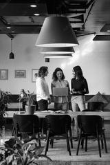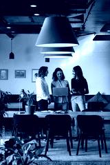 Happy diverse casual businesswomen discussing using laptop and tablet in office