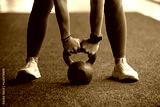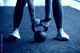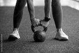 Woman preparing for workout with kettlebell weight at indoor fitness gym, lower body legs and feet closeup of strength training legs