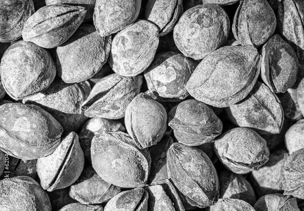 Black and white texture of a pile of apricot kernels in the shell. Background of healthy plant vegan food. Nuts.
