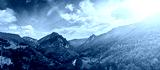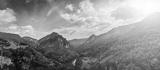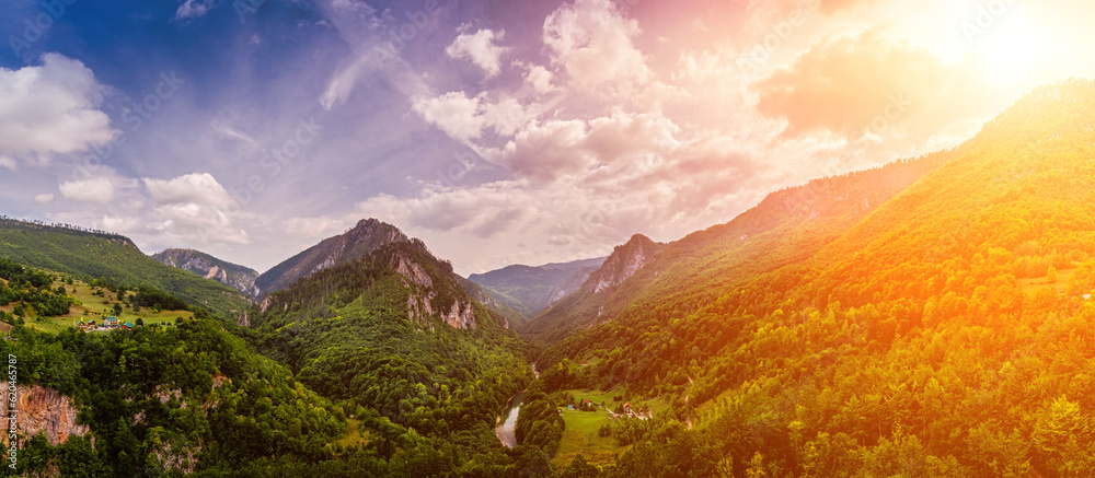 Panorama of high mountains of Tara river canyon at sunset with cloudy sky.
