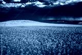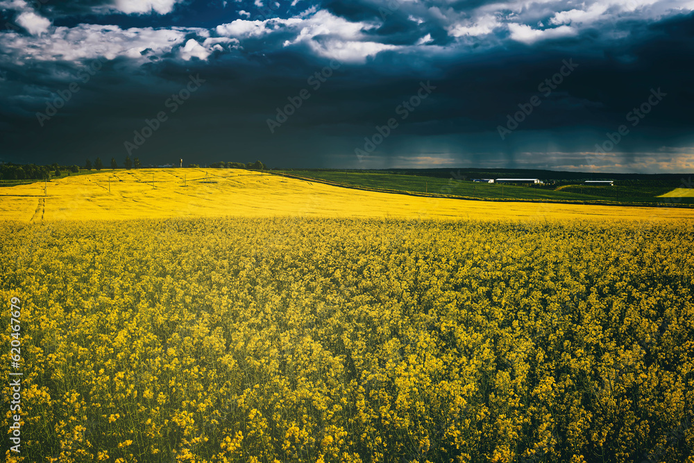 An approaching thunderstorm in a flowering rapeseed field. Aesthetics of vintage film.