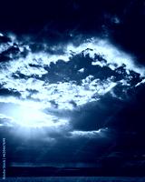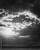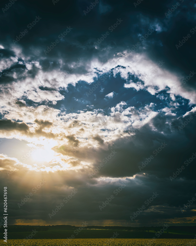 The sun breaking through storm clouds in a flowering rapeseed field. Aesthetics of vintage film.