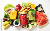 Fresh fruit and vegetable smoothies or juice with various ingredients on light background.