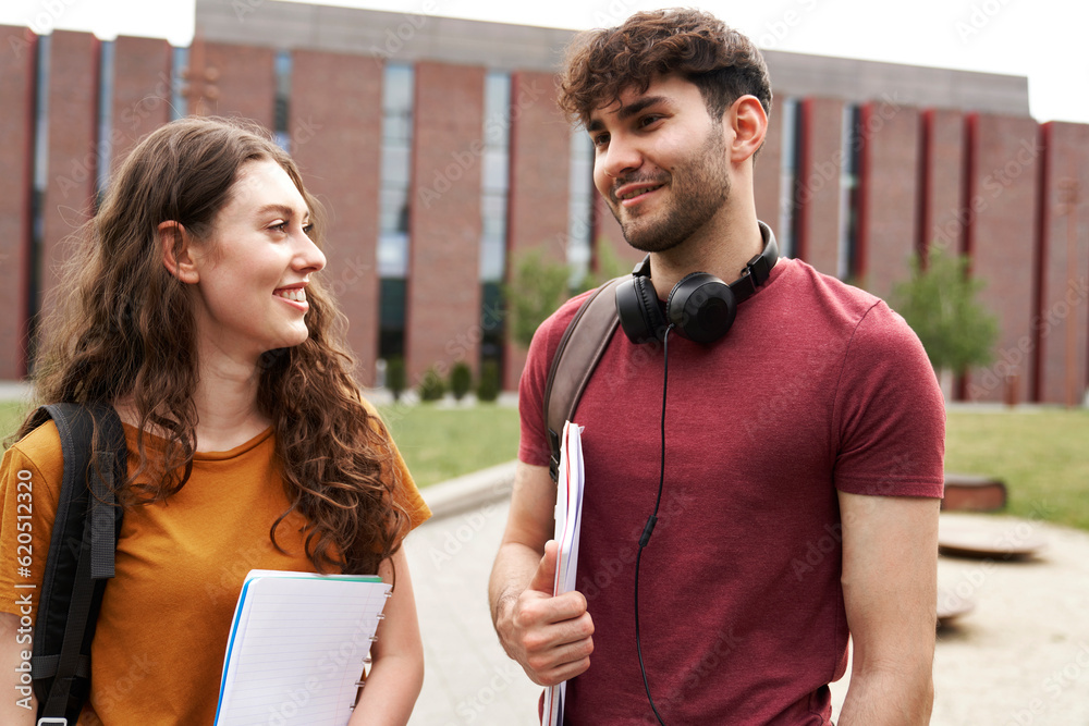 Two caucasian university students standing outside the university campus and talking
