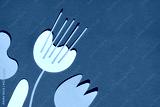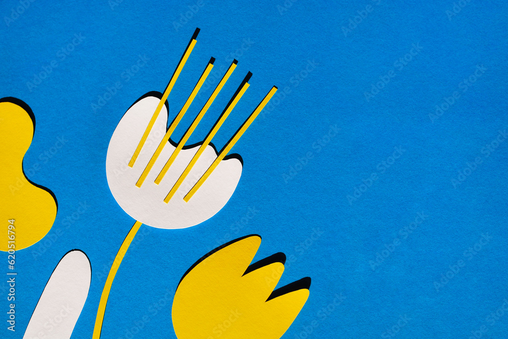 White and yellow handmade paper flowers on a blue background with shadows. Spring or summer season minimal background. Holiday postcard mockup. Space for text. Copy space