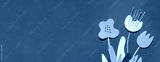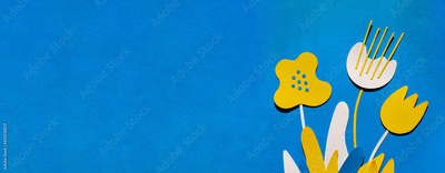 White and yellow handmade paper flowers on a blue background with shadows. Spring or summer season minimal background. Holiday postcard mockup. Banner or header. Space for text. Copy space