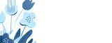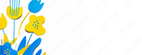 Blue and yellow handmade paper flowers on a white background with shadows. Holiday postcard mockup. Spring or summer season minimal background. Banner. Space for text. Copy space