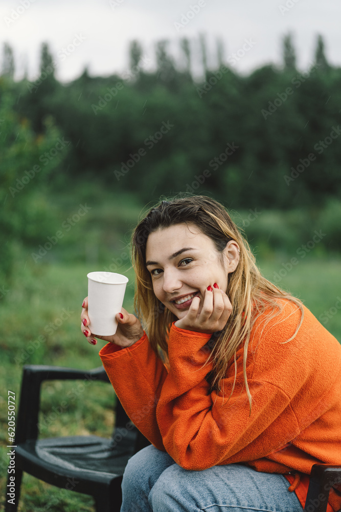 A woman enjoy the tea or coffee by the fire in rainy weather. Hiking camp with a bonfire in the forest. Tourist on recreation outside. Campsite lifestyle