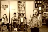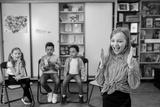 Schoolgirl standing in middle of classroom and answering question in front of classmates and teacher