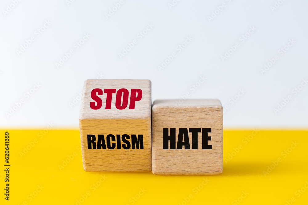 wooden blocks that change the phrase Racism Hate into the slogan stop hate, Beautiful yellow and white background