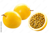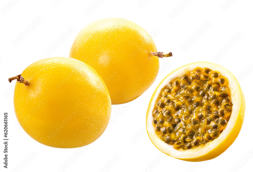 composição com maracujás inteiros e maracujá cortado isolado em fundo transparente
