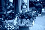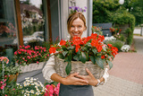 Woman florist small business owner standing in floral store and waiting for client with houseplant