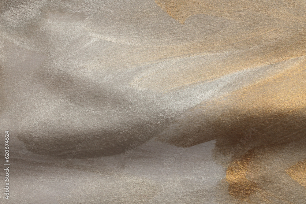 Grain wet watercolor paper texture blot painting wall. Abstract nacre gold, silver marble copy space background.