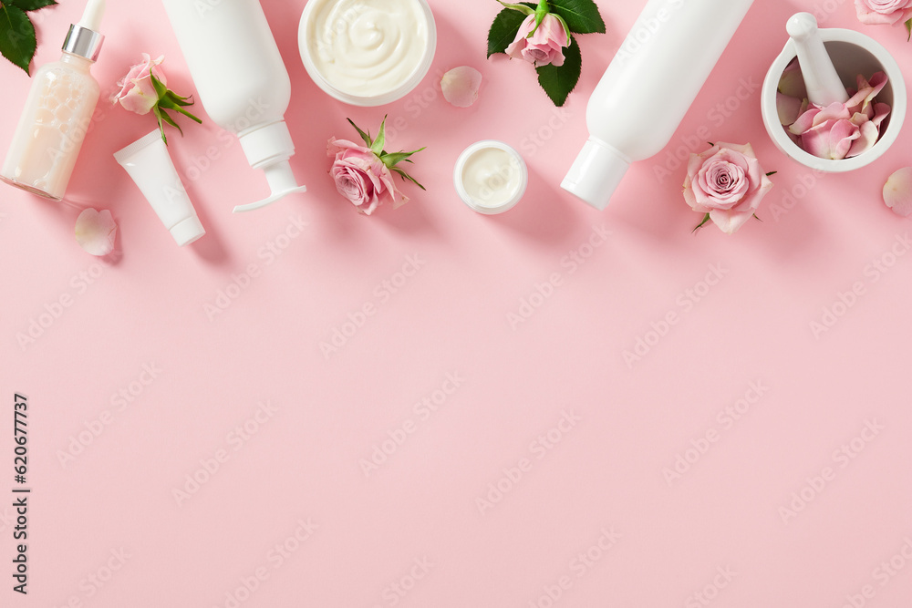 Frame border made of natural cosmetics and skincare beauty products on pink background. Flat lay, top view.