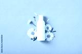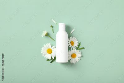 Body lotion with chamomile extract. Cosmetic bottle mockup without labels, beauty product branding.