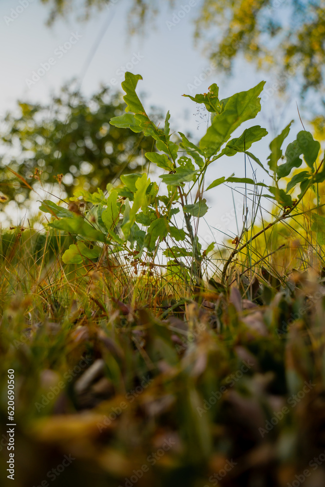Small oak tree growing in the garden. Sprouting from the ground with big oak leaves
