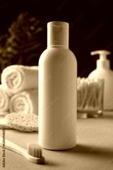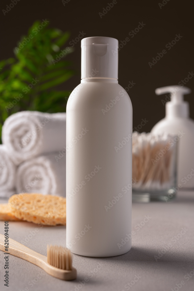 White plastic cosmetic bottle in bathroom interior for mock-up and branding