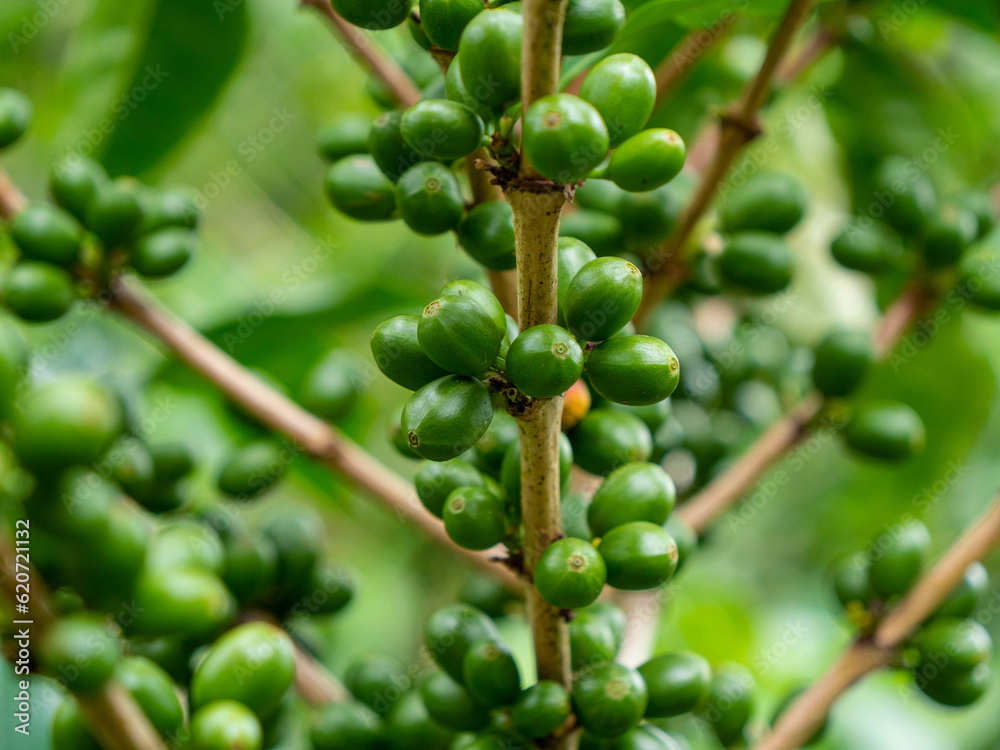 MACRO, DOF: Lush clusters with ripening green fruits on branches of coffee plant